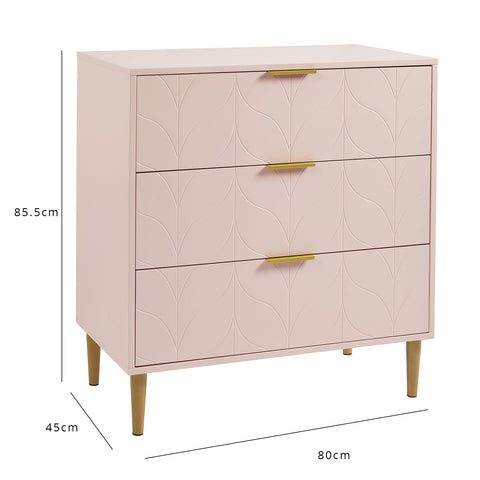 Give your bedroom an art deco inspired glow up with the Gloria chest of drawers. Characterised by intricate carved detailing, beautiful brass effect hardware, and a subtle painted pink finish, this 3 drawer chest of drawers is perfect for adding a glamourous feel to any bedroom space.