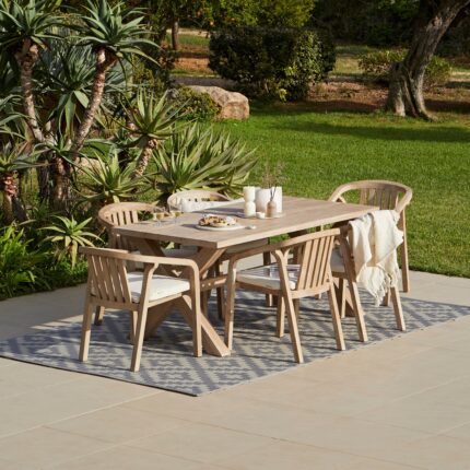 Buyer’s Notes Elevate your garden with the Charlotte dining table set this summer. Crafted from brushed light acacia wood known