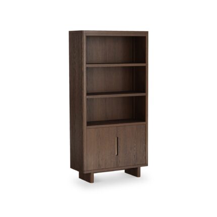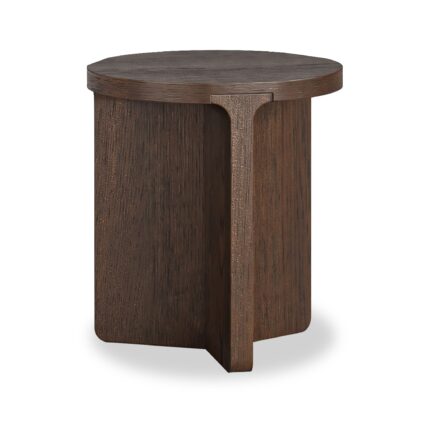 Modern dark oak-stained console table Elegantly curved travertine stone surface Quality oak and manufactured wood base Mid-century modern linear design