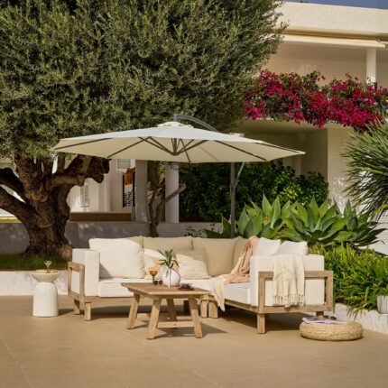 Dakota Wooden Garden Corner Sofa Set with Cream Parasol – Sand Cushions