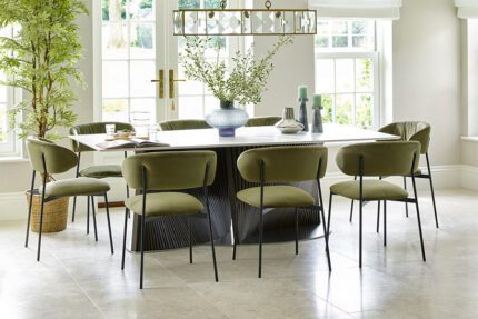 Delicate and blossoming, the Portofino Dining Table with 6 Burano Dining Chairs is a sculptural statement set made to transform