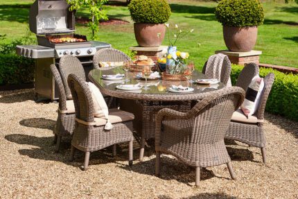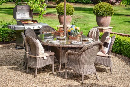 Bring your loved ones together and host your next garden gathering around this elegant Kensington Dining Set. Beautifully handwoven using