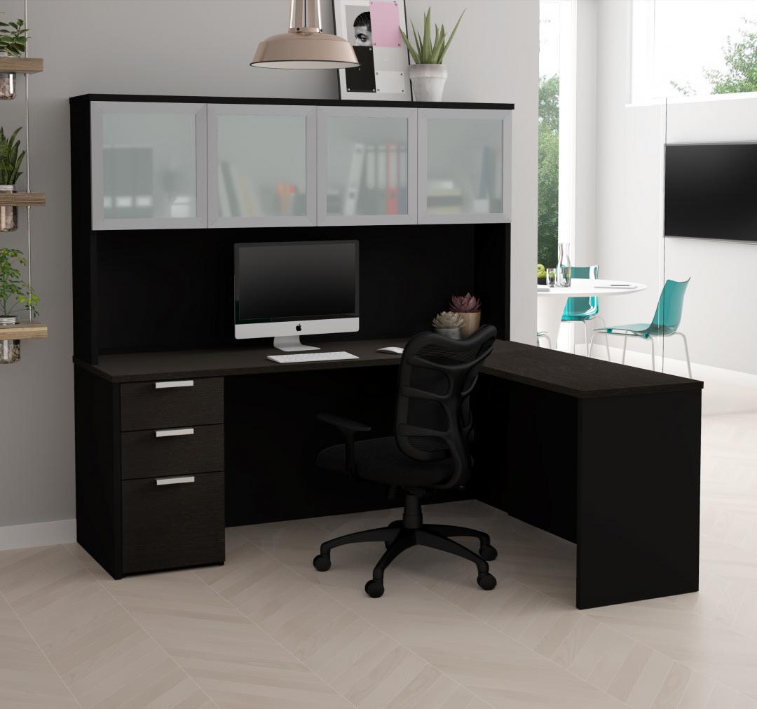 This L-Shaped Desk is spacious yet everything remains within easy reach. The simple and modern design is sure to complement the decor in any room, which makes this desk ideal for a makeshift home office or an open-concept business office. The drawers provide ample storage space, and the lockable drawers keep your personal items secure. The hutch adds plenty of space behind its frosted glass doors to conveniently store office supplies, books, and more. This office workstation is tested to meet ANSI/BIFMA quality standards for safety and performance. This L-Shaped Desk is backed by the Bestar 10 Year Manufacturer‘s Warranty. North American made with local and imported parts.