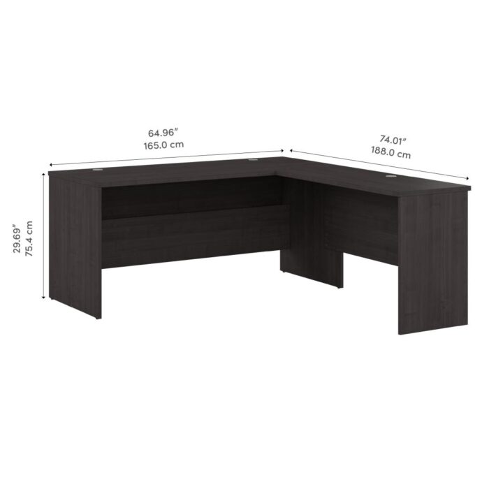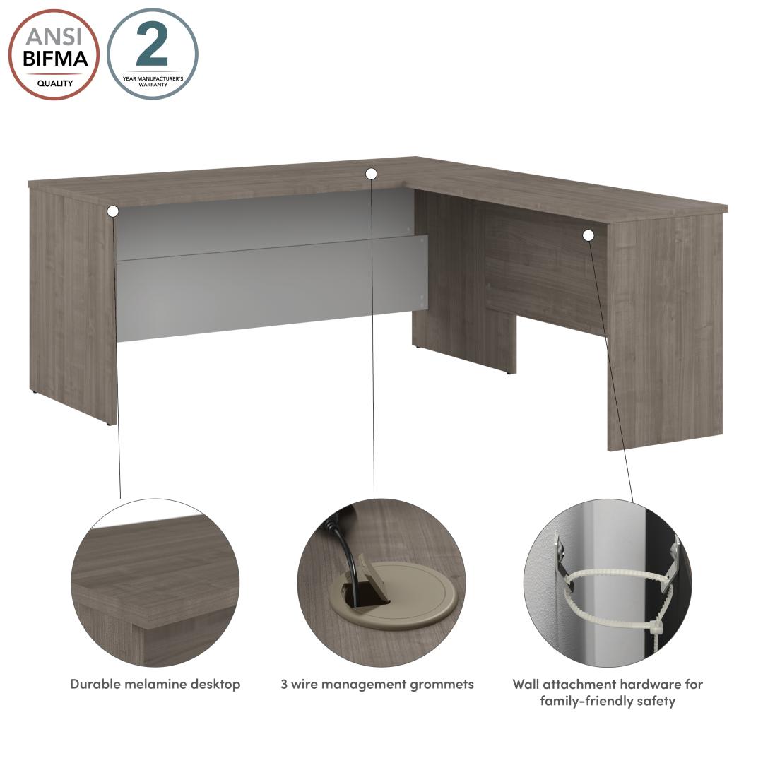 Tackle your next assignment with the Bestar Ridgeley 65W L Shaped Desk. This high-quality workstation will serve for years to come and provide a comfortable desk for you to work on and store your items in. Complete daily tasks on a durable melamine surface that resists scratches, stains, and wear. The sturdy desktop supports up to 200 pounds of office equipment, and wall attachment hardware is included for family-friendly safety and security in any work environment. The home office desk has three wire management grommets to allow for easy organization and concealment of cables. The Return can be installed on either side of the desk for a left- or right-handed configuration. The L-Shaped configuration offers a large work surface that allows you to switch tasks by simply turning your chair from one side of the desk to the other. Moreover, the desk’s modesty panel creates a sense of privacy in any business or home office. This computer desk meets ANSI/BIFMA quality test standards for performance and safety and is backed by the Bestar 2 Year Manufacturer’s Warranty. See the full Ridgeley Collection to create the perfect office space with a file cabinet, bookcase, and more (coordinating items sold separately).