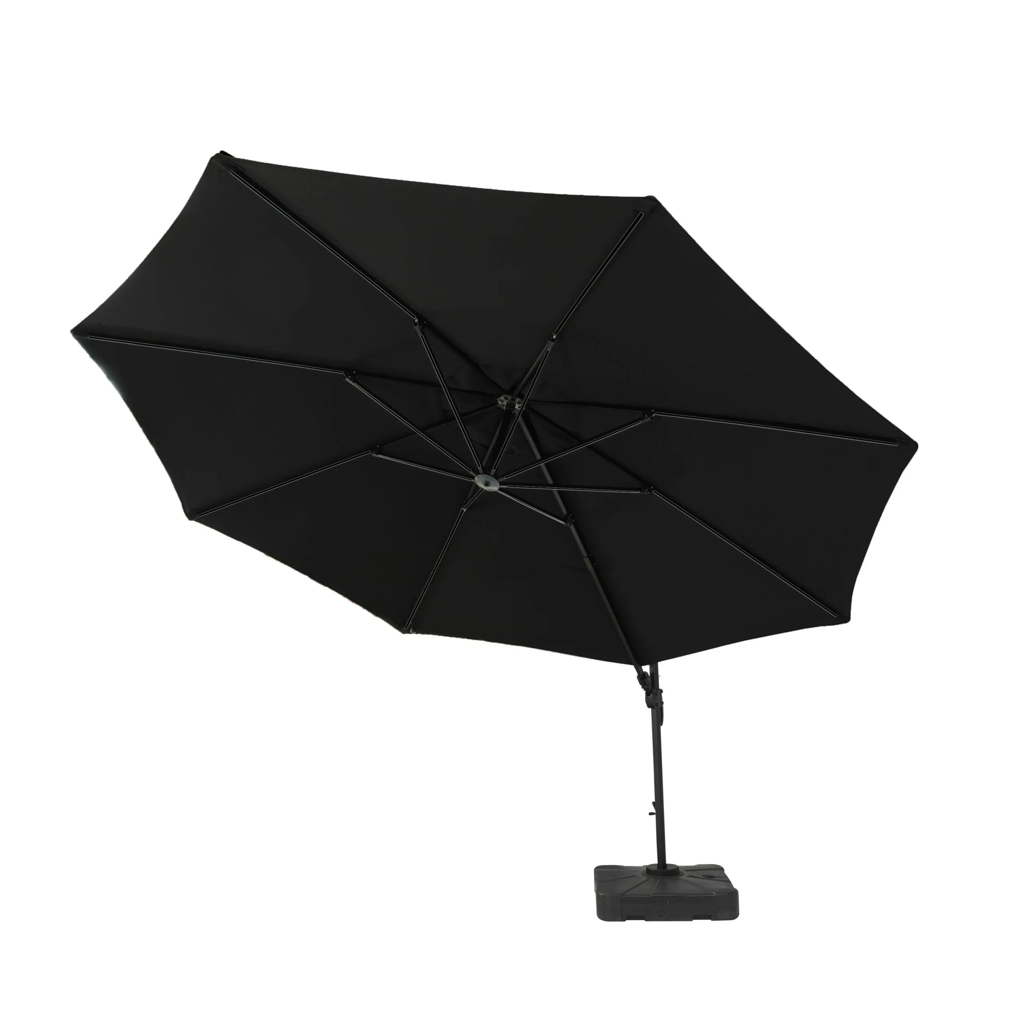 The 3.5×3.5m Cantilever Deluxe Parasol with round canopy design can be used within your dining tables or as a free standing parasol provided you use a weighted base to keep the parasol in place.
