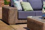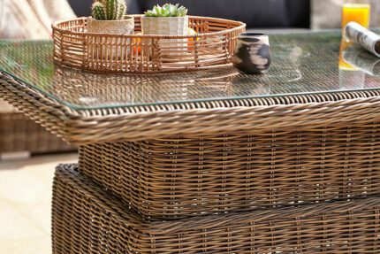 Part of our premium Kensington Collection, this beautiful modular garden lounging set is the perfect place to unwind with the people you love. Handwoven weatherproof Mushroom Brown rattan has been paired with our specially developed 100% Waterproof Cushions in your choice of Grey or Beige to ensure sumptuous comfort and absolute protection against sudden downpours and accidental spillages. The set is finished with a matching rectangular coffee table complete with an easy-to-clean glass tabletop for an effortless experience every time you relax and entertain alfresco.
