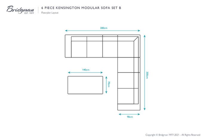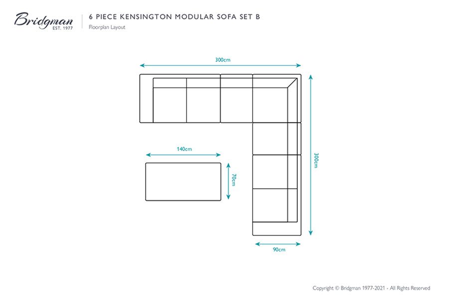 This modular garden lounging set requires a minimum space of 300cm x 300cm and includes: one modular right-hand piece, one modular left-hand piece, one modular corner piece, two modular centre pieces & one rectangular coffee table.