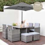 8 Seater Rattan Cube Outdoor Dining Set with Grey LED Premium Parasol – Grey Weave
