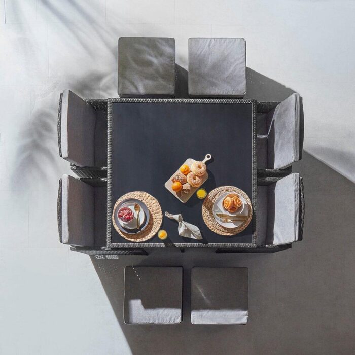 Our 8 seat cube set is perfect for outdoor dining and entertaining. One of the most versatile options for your garden with its compact design; the footstools fit under the seats which then tuck neatly underneath the glass-topped table.