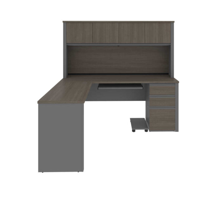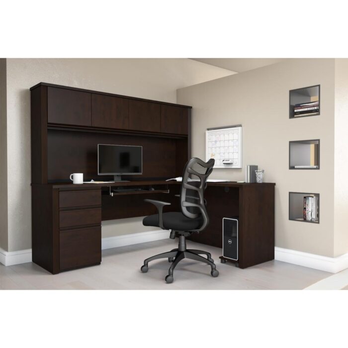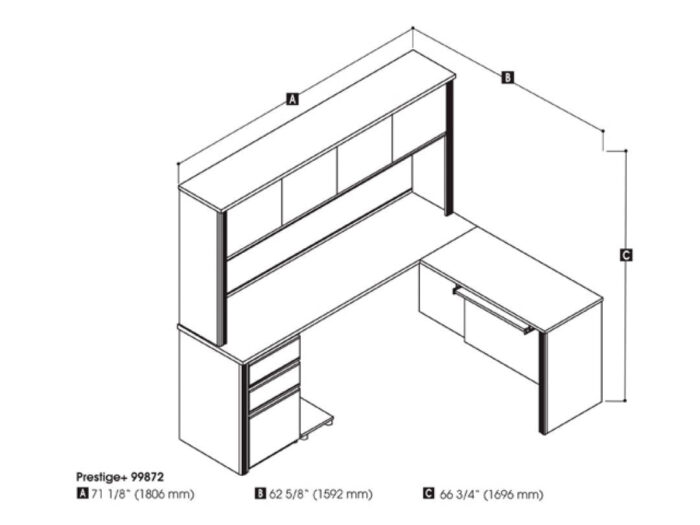 The work surface provides sturdiness while the modesty panel and classic moldings bring elegance to any office. The keyboard tray helps you work from a comfortable position. Thanks to the CPU stand and wire management solutions, it is easy to keep your desktop organized. The utility drawers and the file drawer are perfect for storing supplies and sensitive documents. The lock secures the two bottom drawers to keep your files safe. The closed storage areas accommodate items of various sizes, including letter size binders. The hutch, the credenza, and the return table are tested to meet ANSI/BIFMA quality standards for safety and performance. This L-Shaped Desk is backed by the Bestar 10 Year Manufacturer‘s Warranty. North American made with local and imported parts.