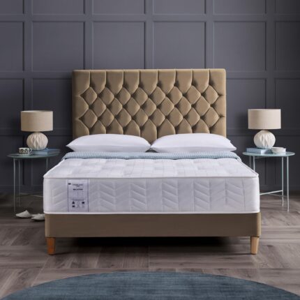 Made in the UK 13.5g coil sprung Visco memory foam Hand tufted stretch fabric Polyester fillings Air Vents & horizontal