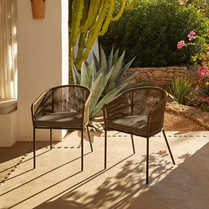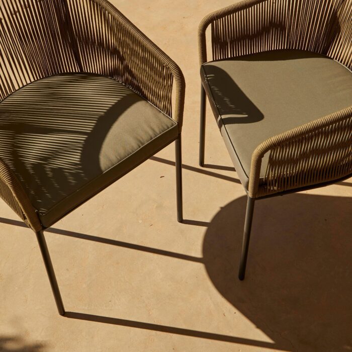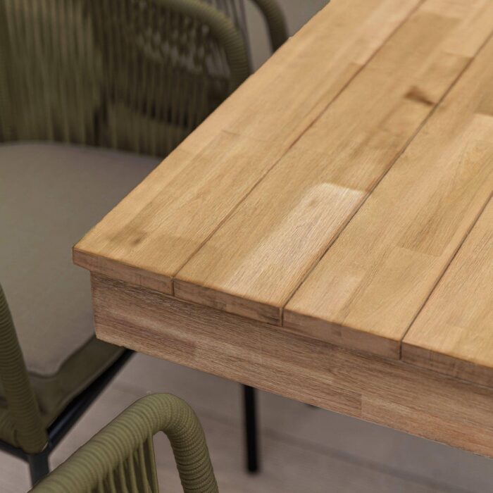 Create the ideal garden dining space with the Amelia table and 6 Hali rope chairs set. The Amelia table is crafted in acacia wood known for its strength and beautiful natural wood grain, with a slatted tabletop and contrasting black legs. The Hali rope chairs are finished in olive green complementing the table and outside greenery beautifully.