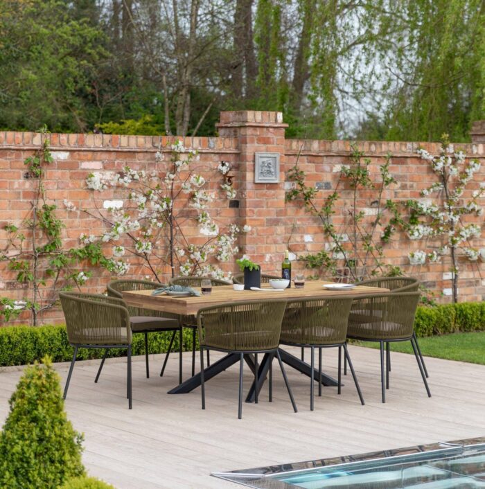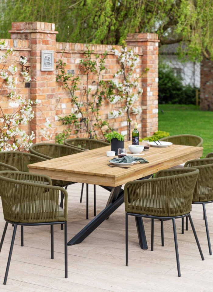 - Set Includes Amelia natural garden dining table with 6 x Hali green garden dining chairs.