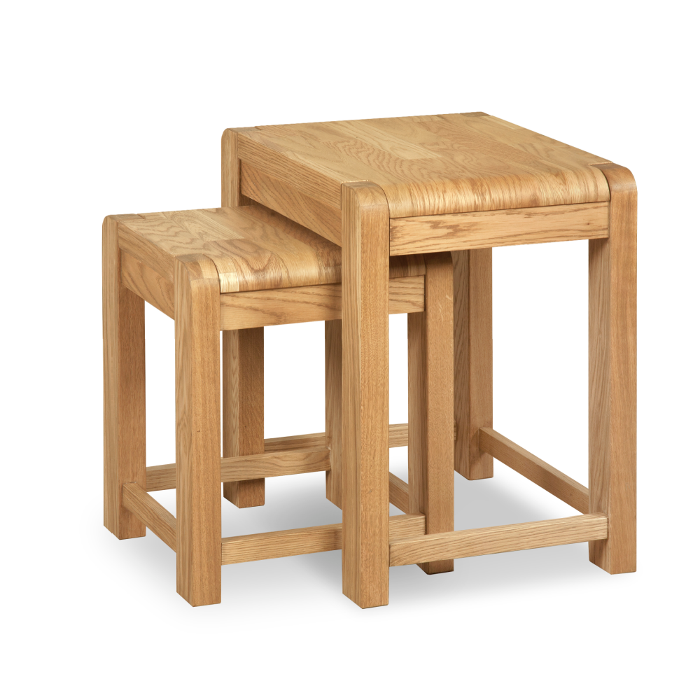 Made from Oak this is the Corndell Bergen collection nest of two tables. It is finished in clear lacquer which allows the grain of the timber to show, making each nest of tables fully natural and effectively unique. The tops are a thick butchers block style which has rounded corners to soften the lines and there are stretchers between the legs of each table,