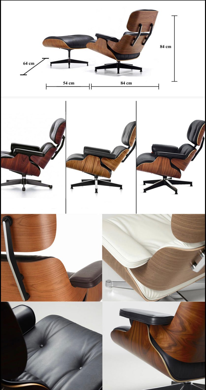 Eames Style Office Chair – Material: Real Leather/ Walnut Color: Black X6100 Product size:76*74*111-117cmSeat width 57Seat Depth 52SH:50-56cm Armrests