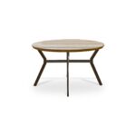 - Table design features – Round table with teak effect slatted wood tabletop & steel legs.