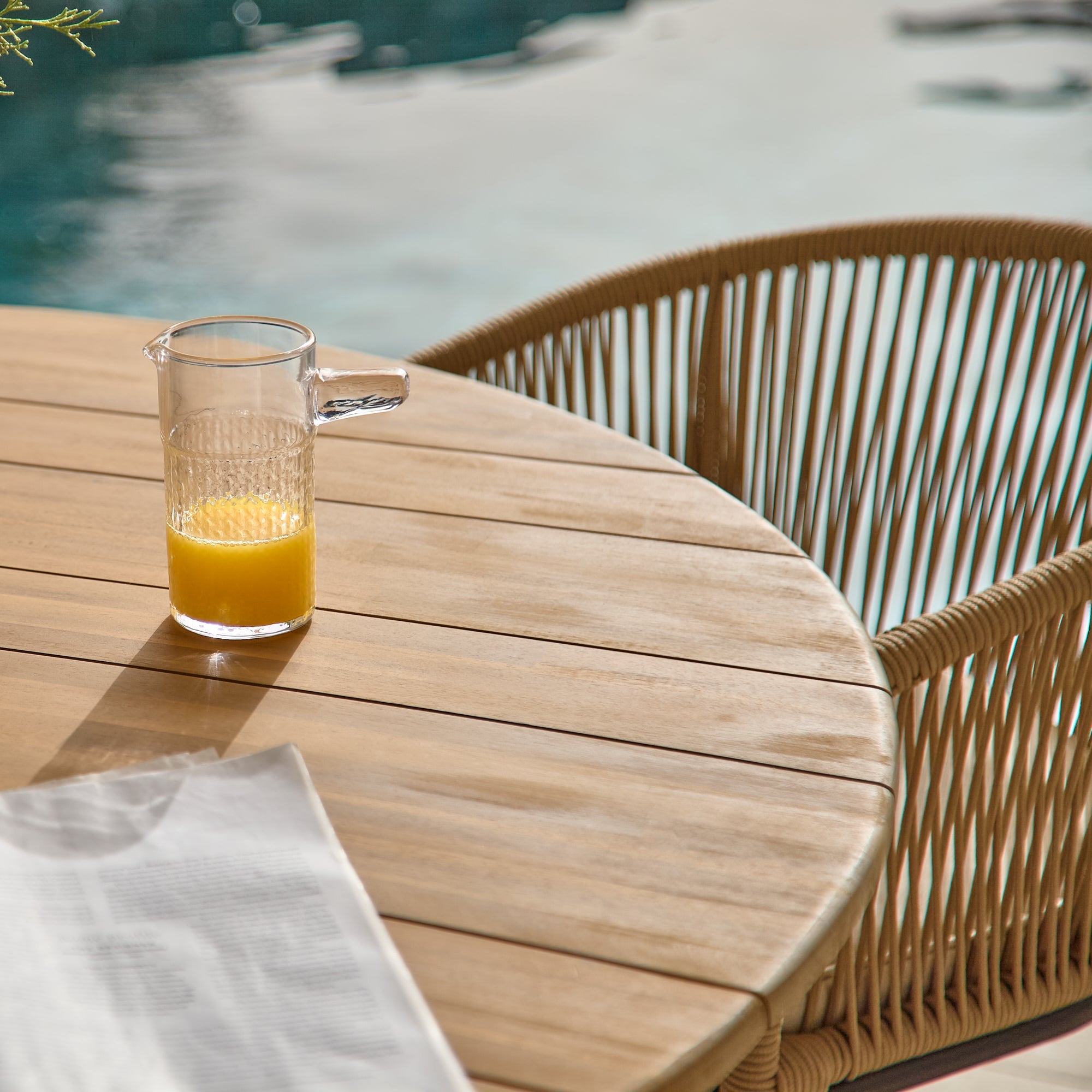 Perfect for family dining, the Ezra and Hali 4-seater garden set blends natural wood and rope with steel for a high-quality, modern design that is both stylish and practical.