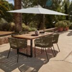 The Hali 6-seater outdoor dining set includes a 175cm acacia wood-topped table and 6 Hali green garden rope dining chairs, ideal for summer family meals and enjoyable dinner parties with friends. This outdoor dining set also comes with a cream lean-over parasol for shade and shelter.