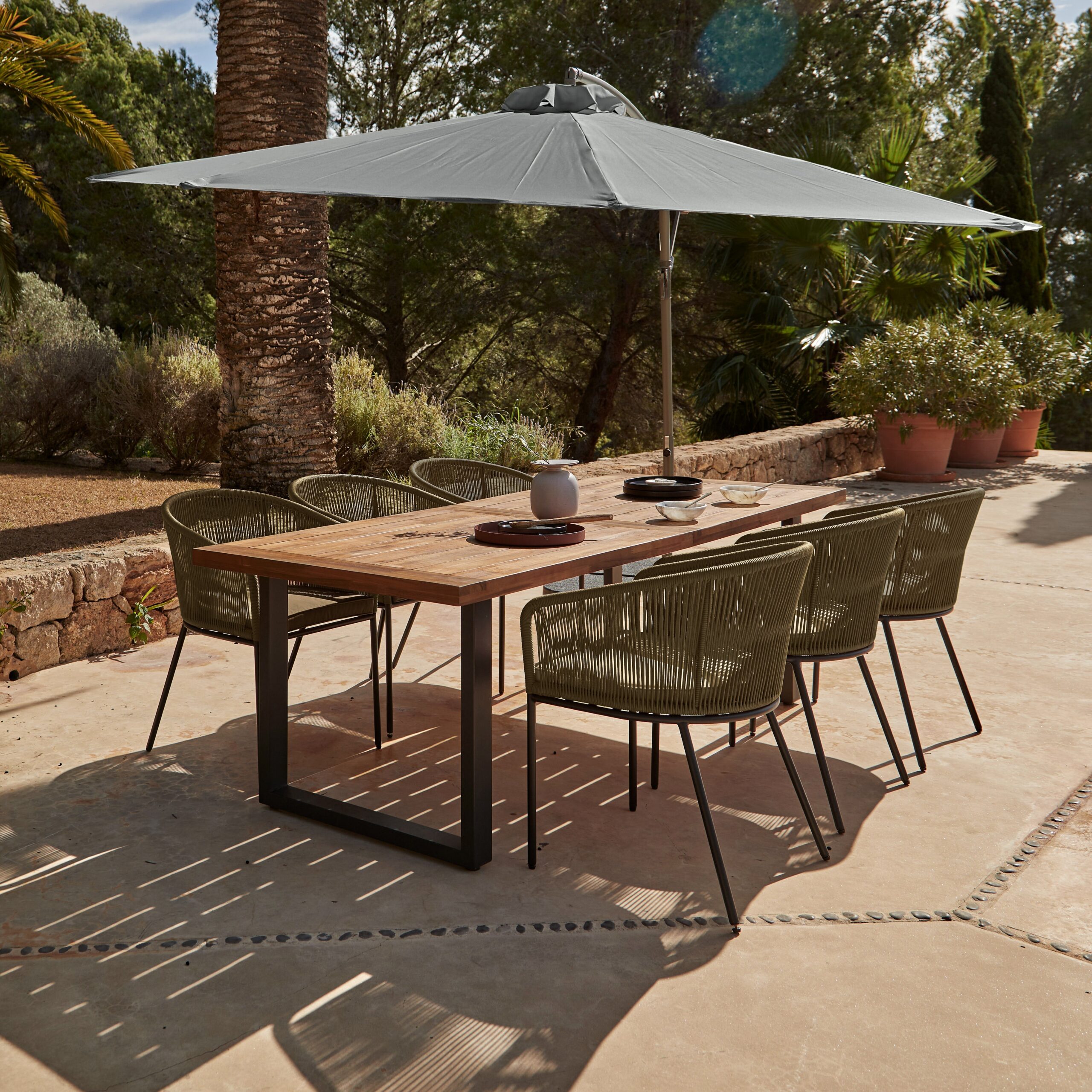 The Hali 6-seater garden dining set features a 235cm solid wood table, paired with the six green garden rope chairs. This set provides ample seating for garden dinner parties whilst adding a touch of charm to your outdoor space. Enjoy stylish and comfortable dining in a setting that effortlessly combines functionality and visual appeal. This outdoor dining set comes complete with a grey lean-over parasol.