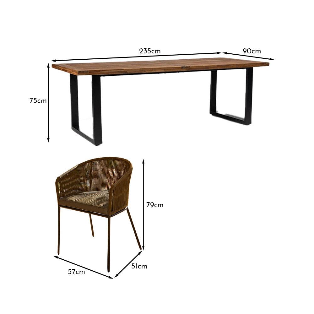 The Hali garden dining set is a stunning statement piece sure to impress. The rugged, industrial-style table is perfectly complemented by the intricate details of the Hali green rope garden chairs, creating the perfect alfresco dining set.