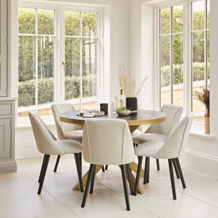 The Jade and Freya dining set will instantly elevate your home. The jet-black Jade rectangular dining table is made from durable acacia wood and features a large oval cut out design in the base of the table. With plenty of space for seating the Jade table is paired with 6 Freya dining chairs each finished in stylish ecru boucle for a textured look with black legs.