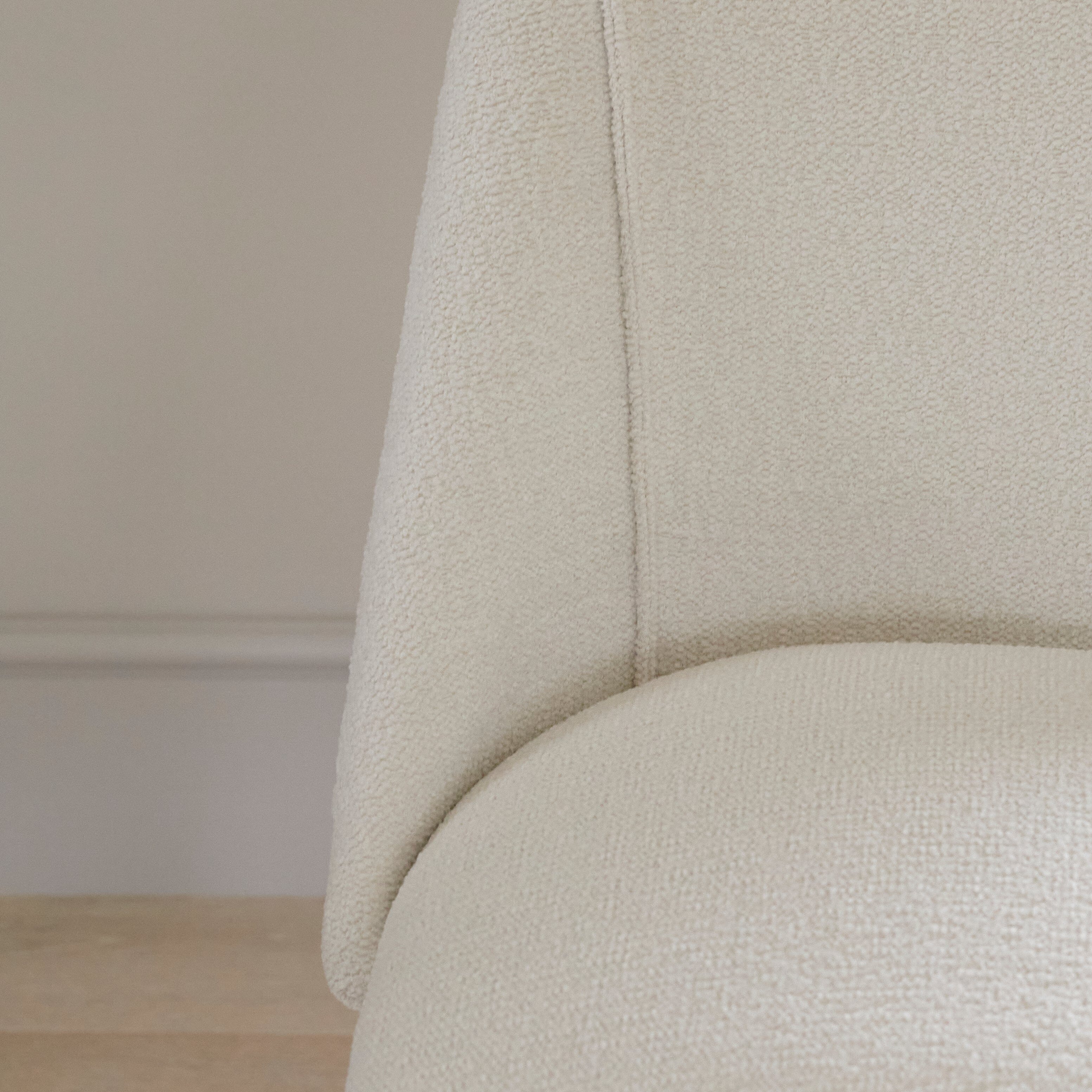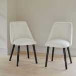 - Chair Design Features – Upholstered ecru boucle, contemporary design and black legs.