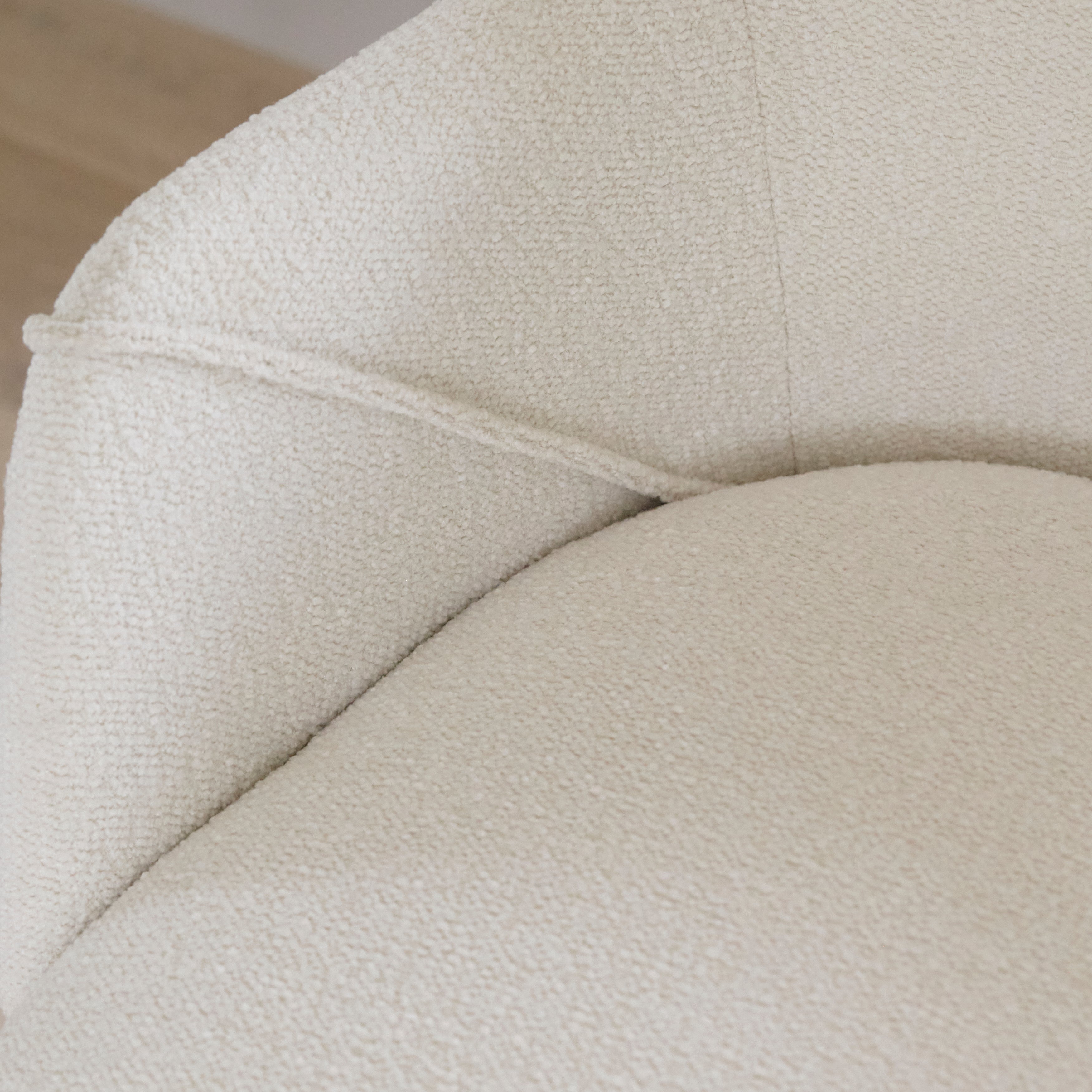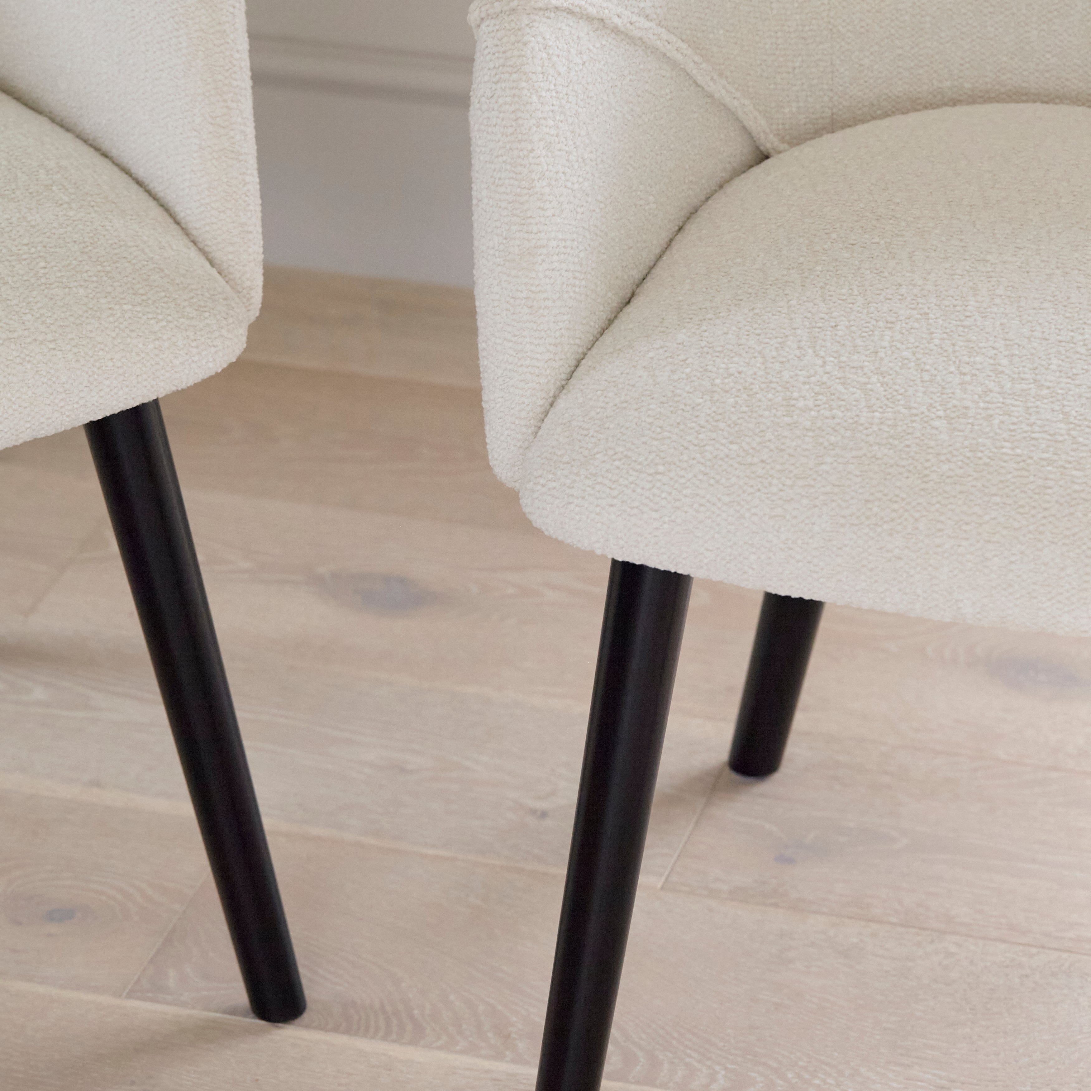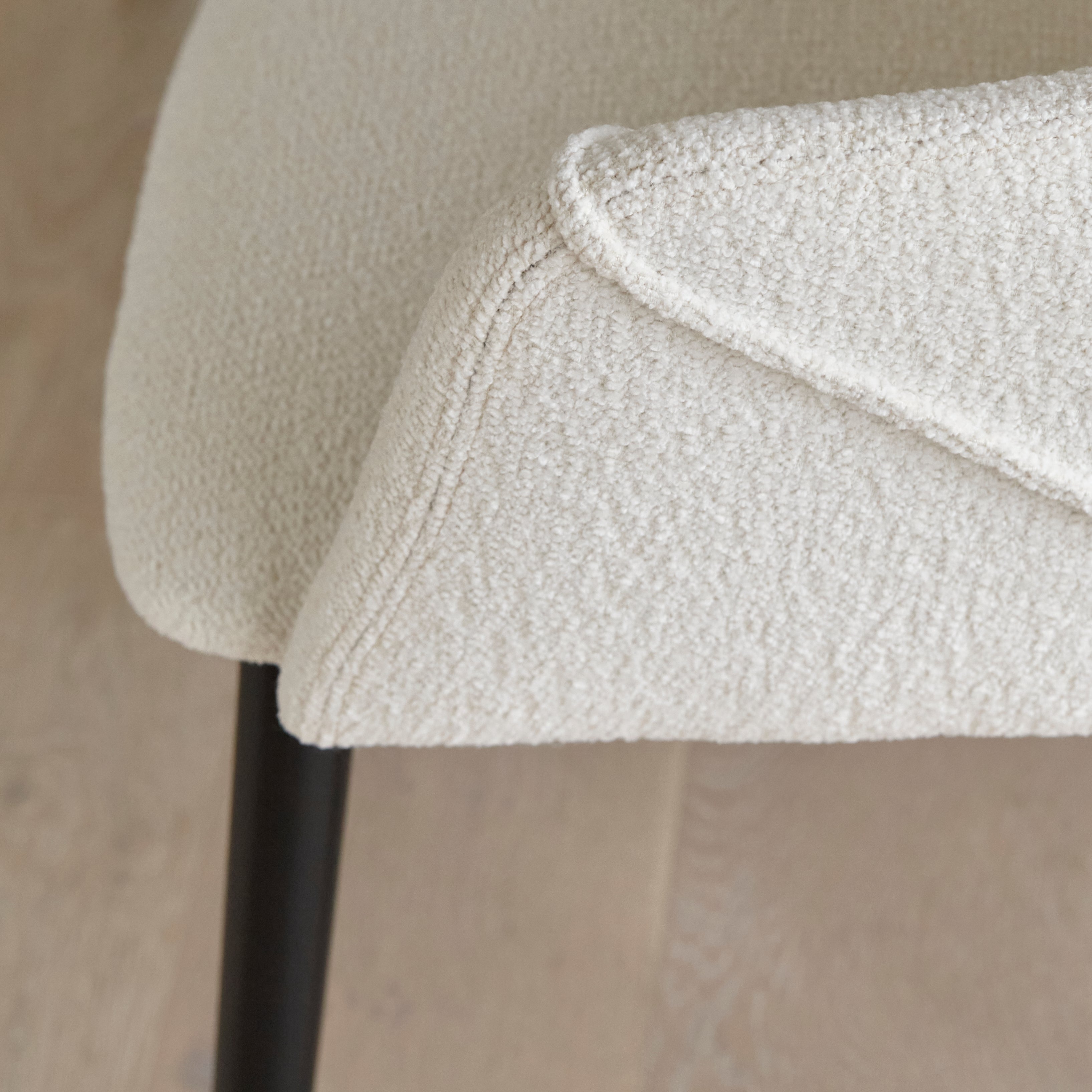 - Chair Design Features – Upholstered ecru boucle, comfy back and armrest and black legs.