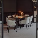 The Jade solid acacia wood table in jet-black will create a statement look in your home and the unique cut-out design element creates a focal point. The elegant boucle Freya chairs with black legs complement the Jade table beautifully.