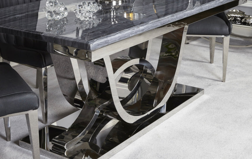 Exude style and sophistication in your dining room or hall with this sleek marble to match your dining table. Featuring an interlocking curve design chrome base with a marble effect table top.
