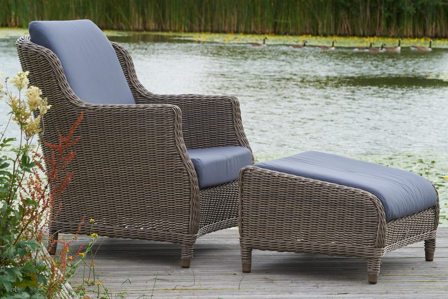 Part of our premium Kensington Collection, both the outdoor lounge armchair and footstool have been expertly handwoven using our finest weatherproof rattan in Mushroom Brown. Designed with comfort and durability in mind, the armchair’s high back and armrests provide comfort and support for sitters, while our exclusive Fully Waterproof Cushions in your choice of Grey or Beige ensure you never have to worry about sudden downpours or accidental spillages again.