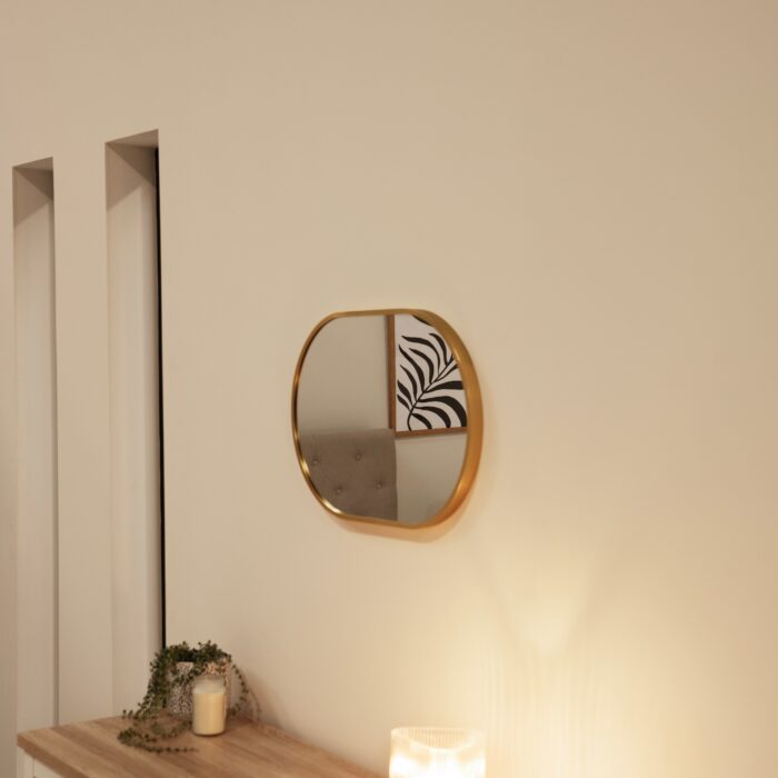 With its generous dimensions of 60cm in height, 40cm in width, and a slim depth of 2.7cm, this gold rounded mirror is perfectly sized to make a statement in your living room, dining room, or hallway. Its lightweight yet sturdy construction, weighing only 2.5kg, ensures easy installation and hassle-free manoeuvring.