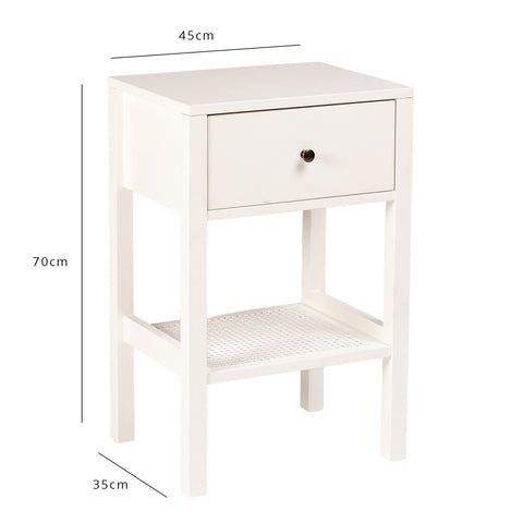 With a boho inspired feel, the Charlie bedside table in white exudes a retro rattan charm. Charlie combines a natural design with a textured finish painted in white, this bedside table has a matching cane shelf as well as a brass effect handle to enhance its bohemian design. Featuring one drawer, this white bedside table has space for all your bedtime essentials, as well as a shelf for additional storage space that’s perfect for books and magazines.
