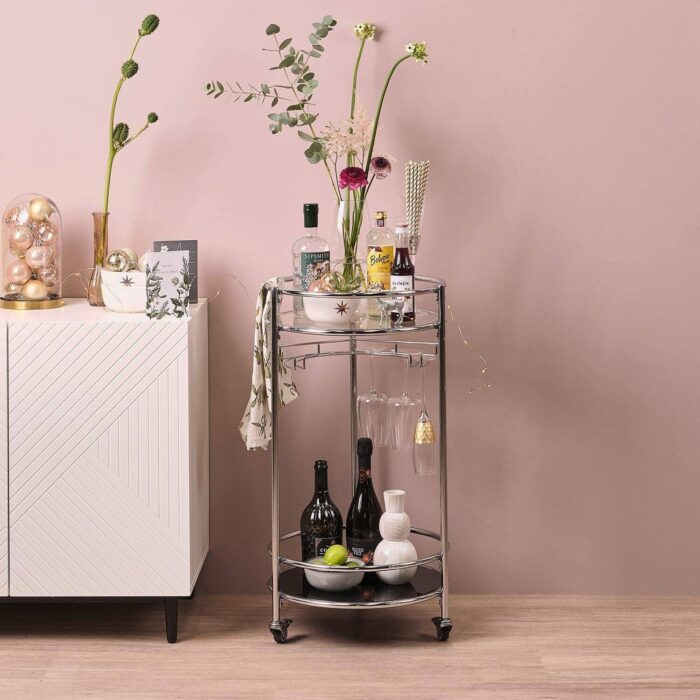 Finished in chic chrome, this charming bar cart allows you to add a touch of art deco into any living or entertaining space within your home. With three lockable wheels, you can easily move this cart around, allowing you to easily entertain family and friends, whatever the occasion.