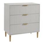The brass effect handles and feet offer a chic contrast to the classic painted grey finish. The front of each of the three drawers features a beautiful carved detail, resulting in something simple yet striking.
