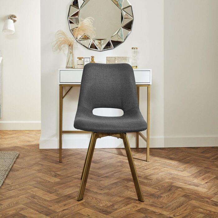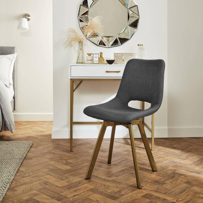 Update your office space in style with our Margot swivel desk chair. With bold brass effect legs and an upholstered seat in a soft grey fabric, your office chair has never looked as glamourous as the Margot.