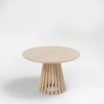 The Willow pale oak coffee table by Laura James is the perfect addition to your living space this season. Designed with style and function in mind, this wooden coffee table with structural design inspired by Japandi décor is modern and creative, featuring a tapered pedestal base with slatted wood panels, topped with a circular wood top.