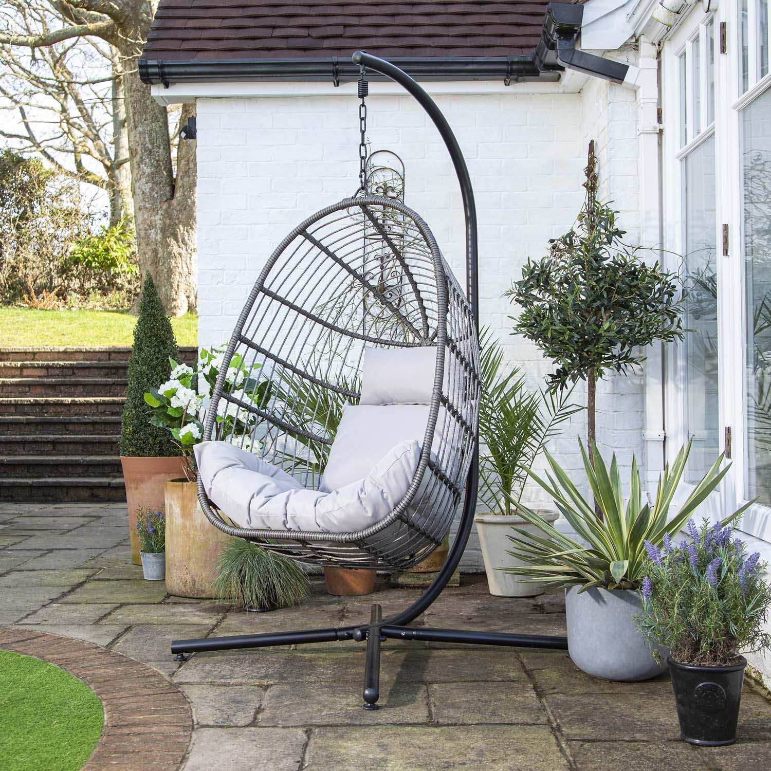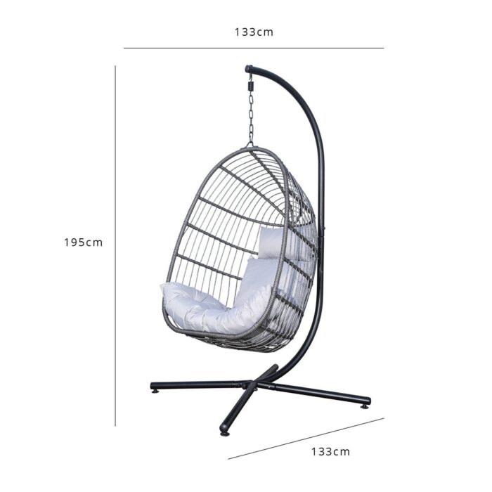 Relax in comfort this summer with the Wick hanging egg chair. This grey rattan hanging egg chair will become your favourite place to enjoy the summer sun. With three comfortable grey cushions and a sturdy cross stand its practical and stylish.