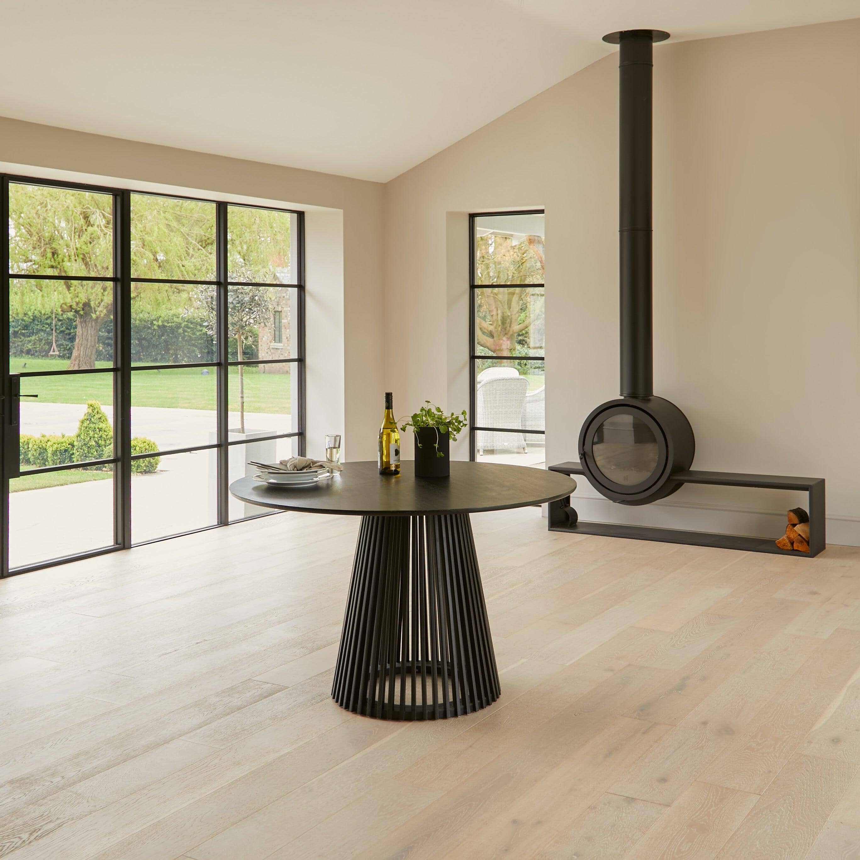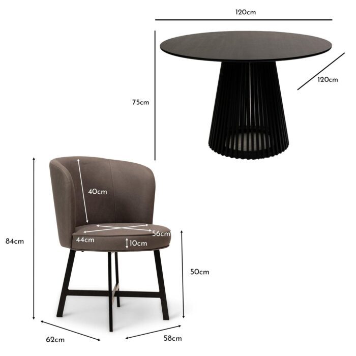 Create the perfect focal point in your dining room with the Willow and Jacob round dining table set. Featuring a black oak veneer tabletop with a pedestal tapered rubberwood base, this wooden dining table highlights an intricate and distinctive design inspired by Japandi decor. The 4 Jacob grey dining chairs perfectly complement the willow dining table, with a curved back, round padded seat in steel grey, and black metal legs. This dining set creates the ultimate stylish and uniquely modern dining set and is ideal for smaller spaces.