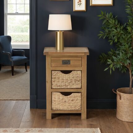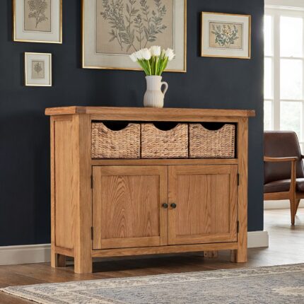 Original price was: £369.95.£184.98Current price is: £184.98.Zelah Oak Small Sideboard with Baskets